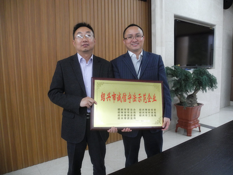 公司一直坚持忠实守信,依法谋划原则,经绍兴市普法办、绍兴市经信委、绍兴市司法局、绍兴市环保局、绍兴市国资委、绍兴市工商局、绍兴市质监局等7家部分团结评审,2013年11月被评定为绍兴市“诚信遵法树模企业”。